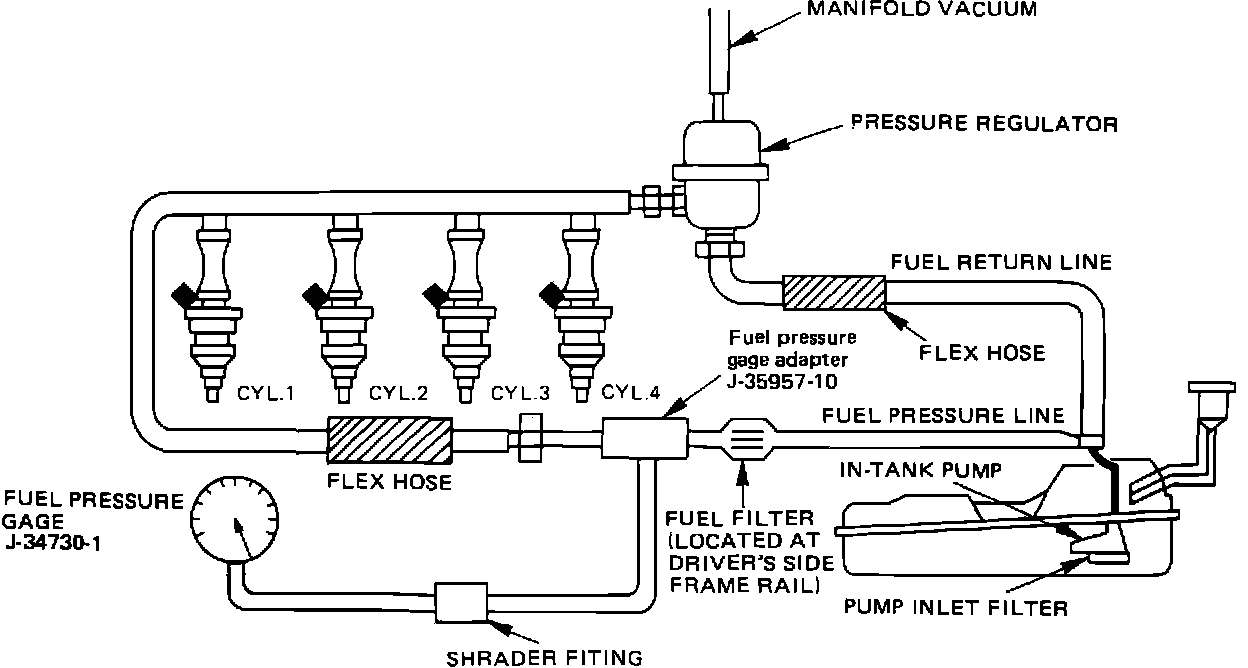 2. While the engine is idling, manifold pressure (vacuum) is low. When applied to the fuel regulator diaphragm, the pressure will result in a lower fuel pressure of about 190-200 kPa (25-30 psi).
