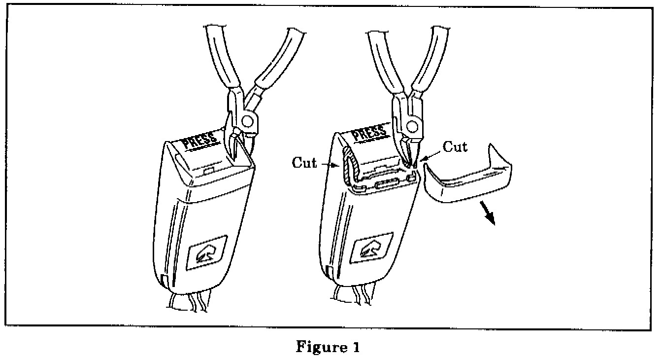 3. Using a small pair of wire cutters, carefully cut the plastic outer cover of the front seat belt buckle along the separation line between the two cover halves (Figure 1).
