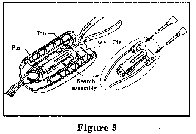 5. (Driver front seat belt buckle only) Using the wire cutters, carefully cut the three plastic pins that hold the switch assembly to the lower cover. Cut the bottom pin first, slide the switch down, then cut the top two pins (Figure 3).