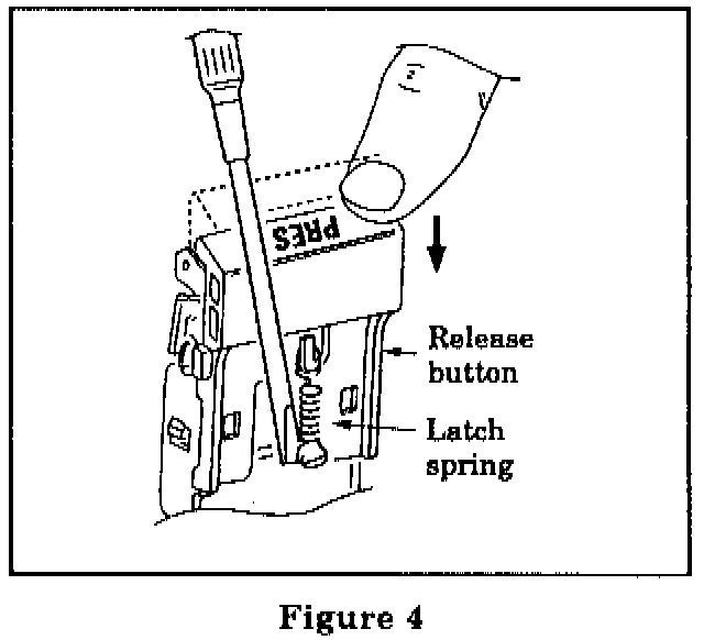 9. Remove the release button and latch spring by applying a slight upward force while pulling the release button out of the buckle assembly (Figure 5).