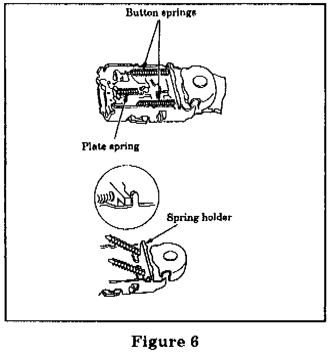 When using compressed air be sure to wear proper eye protection to prevent injury. Take extreme care blowing compressed air around the spring holder (Figure 6). The two button springs mounted on the spring holder rails can easily slide off or eject from the rails. If this happens and a button spring is lost, the buckle assembly becomes inoperative. Call the Isuzu Care Team Line immediately at 1-800-666-3411 for further instructions.