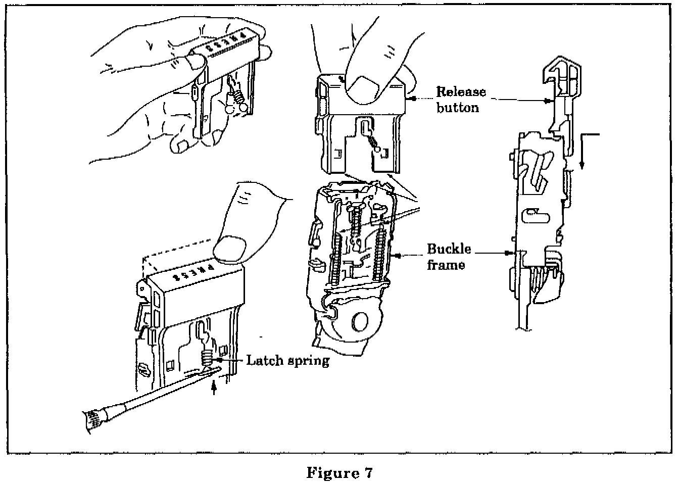 11. Insert the new release button into the buckle assembly. Press the release button and attach the latch spring using a small screwdriver (Figure 7).