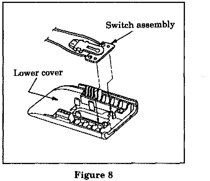 Position the switch assembly over the plastic pins on the new lower cover. Apply gentle pressure to the corners of the switch assembly to snap it into place (Figure 8).