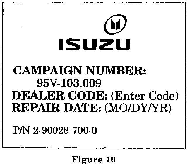 20. Affix a campaign label (Part No. 2- 90028-700-0) adjacent to the manufacturer's identification label located inside the driver's door. Using a ball-point pen, fill in the label with Campaign Number 95V-103.009, Isuzu dealer code, and repair date (Figure 10).