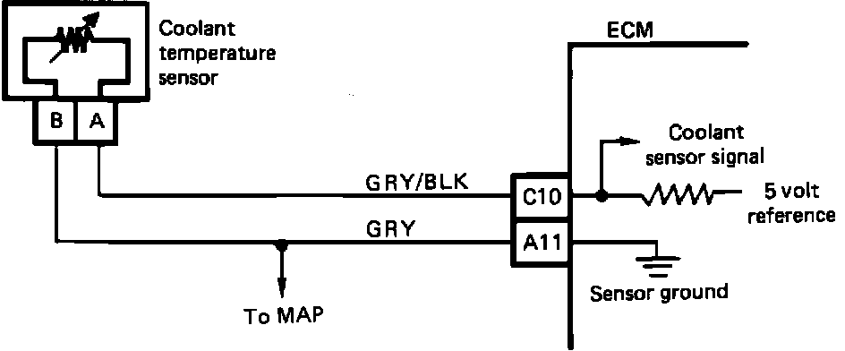 The Coolant Temperature Sensor (ECT) uses a thermistor to control the signal voltage to the ECM. The ECM applies a voltage on GRY/BLK wire to the sensor. When the engine is cold, the sensor (thermistor) resistance is high, therefore, the ECM will sense high signal voltage. As the engine warms, the sensor resistance becomes less, and the voltage drops. At normal engine operating temperature, the voltage will measure about 1.5 to 2.0 volts at the ECM terminal A11. Coolant temperature is one of the inputs used by the ECM to control the following: