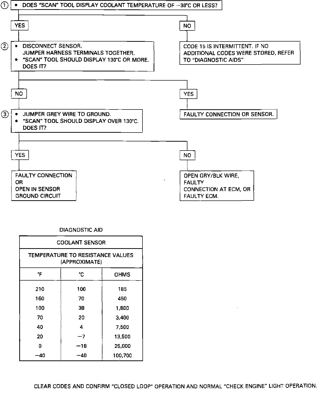 1. Checks to see if code was set as result of hard failure or intermittent condition. Code 15 will set if signal Voltage indicates a coolant temperature below -39°C (-38°F) and the engine has been running for 120 seconds.