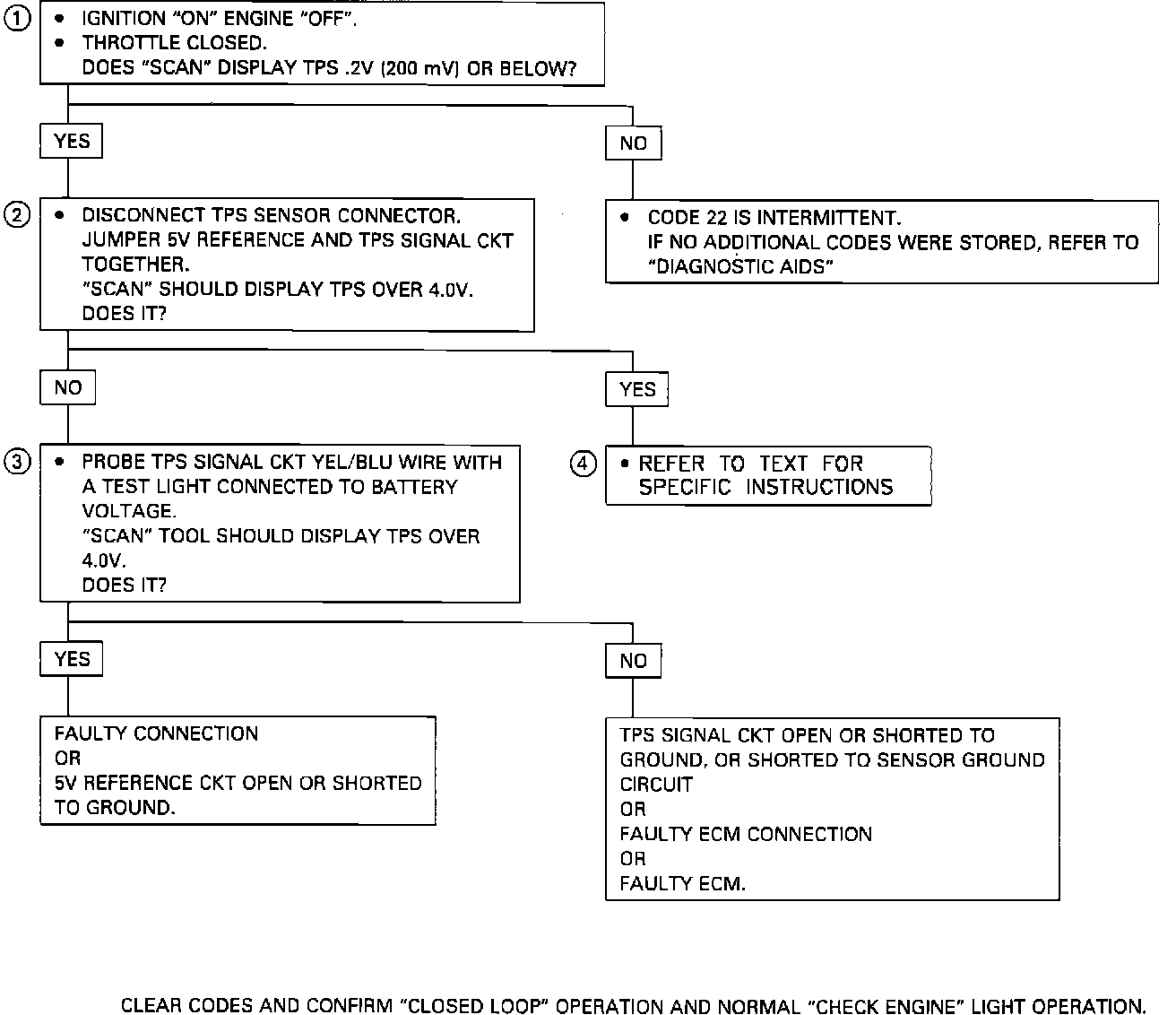 A Scan tool displays throttle postion in volts. Closed throttle voltage should be less than 1.25 volts. TPS voltage should increase at a steady rate as throttle is moved to WOT. An open or grounded BLU/ORN wire or YEL/BLU wire will result in Code 22. If Code 22 is intermittent,