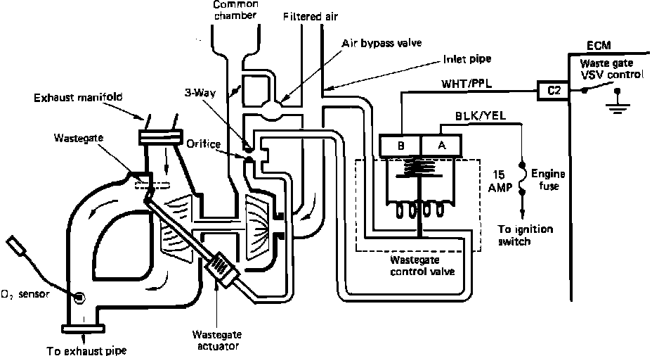 The wastegate is normally closed, but opens to prevent an overboost condition. The wastegate opens when when pressure is applied to the controller (diaphragm). Pressure to the diaphragm is controlled by an ECM controlled duty solenoid. A boost increase will be detected by the MAP sensor and the ECM will "pulse" the solenoid. Under normal driving conditions, the solenoid is energized which closes off the pressurized air passage to the diaphragm. This allows full turbo boost. When the ECM detects excessive boost pressure, it cycles the solenoid on and off, allowing boost pressure to act on the diaphragm. The diaphragm moves the wastegate allowing exhaust gas to bypass the turbine, slowing the turbine. As boost pressure reduces, the ECM energizes the solenoid and boost pressure in the diaphragm bleeds off through the vent in the solenoid. If overboost cannot be reduced through the wastegate, the ECM will reduce fuel delivery to prevent engine damage.