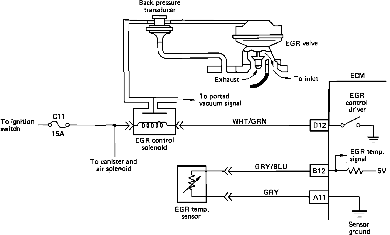 The EGR vacuum valve is controlled by an ECM controlled solenoid. The ECM will turn the EGR "ON" and "OFF (Duty Cycle) by grounding WHT/GRN wire. The duty cycle is calculated by the ECM, based on information from the coolant temperature sensor and the throttle position sensor. With the ignition ON and the engine stopped, the EGR solenoid is de-energized and by grounding the diagnostic terminal, the solenoid is energized.