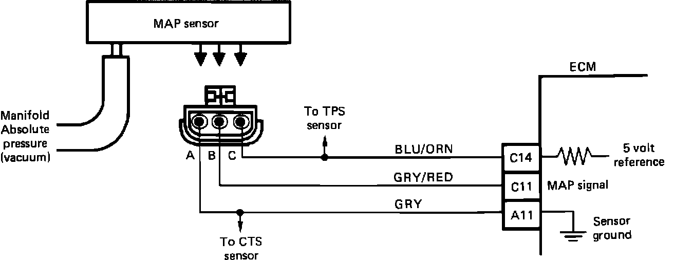 The Manifold Absolute Pressure (MAP) sensor responds to changes in manifold pressure (vacuum). The ECM receives this information as a signal voltage that will vary from about 0.53-0.61 volts, at closed throttle idle, to 2.18-4.28 volts at wide open throttle (low vacuum). If the MAP sensor fails, the ECM will substitute a fixed MAP value and use the TPS to control fuel delivery.