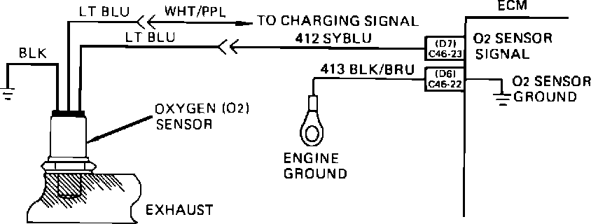 The ECM supplies a voltage of about .43 volt between terminals "C46-23" and "C46-22". (If measured with a 10 megohm digital voltmeter, this may read as low as .32 volts.) The O2 sensor varies the voltage within a range of about 1 volt, if the exhaust is rich, down through about .10 volt, if exhaust is lean. The sensor is like an open circuit and produces no voltage, when it is below about 360~ (600~F). An open sensor circuit, or cold sensor, causes "Open Loop" operation.
