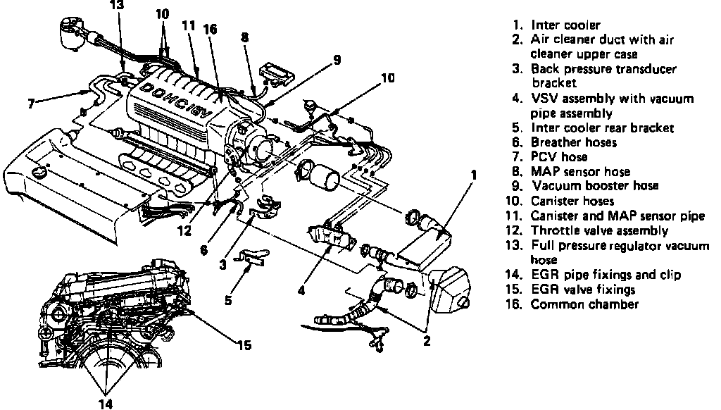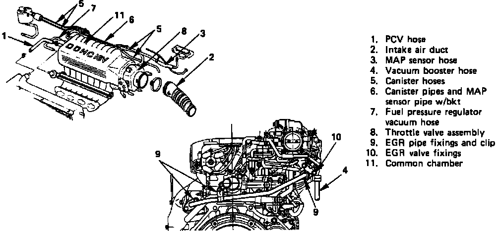 7. Disconnect canister hoses, then the EGR vacuum lines.
