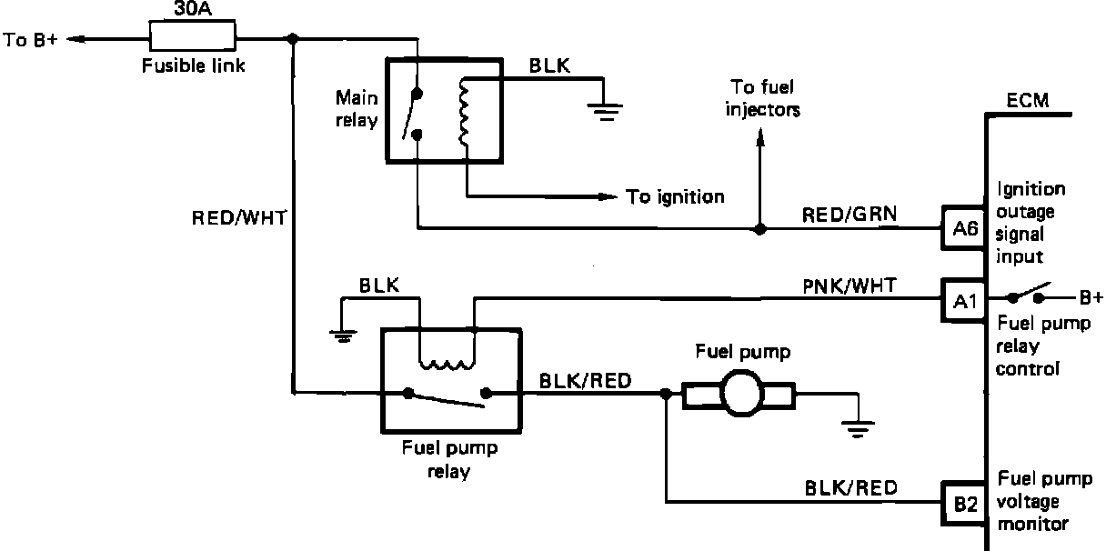 1. Checks for the presence of B+ at switching portion of fuel pump relay.