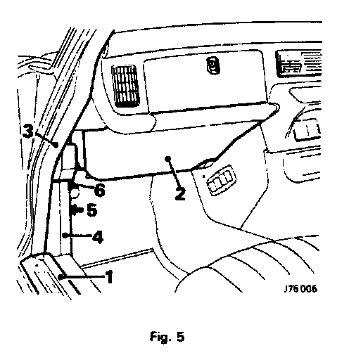 - Remove two screws (5, fig 5) securing trim casing to side of footwell.