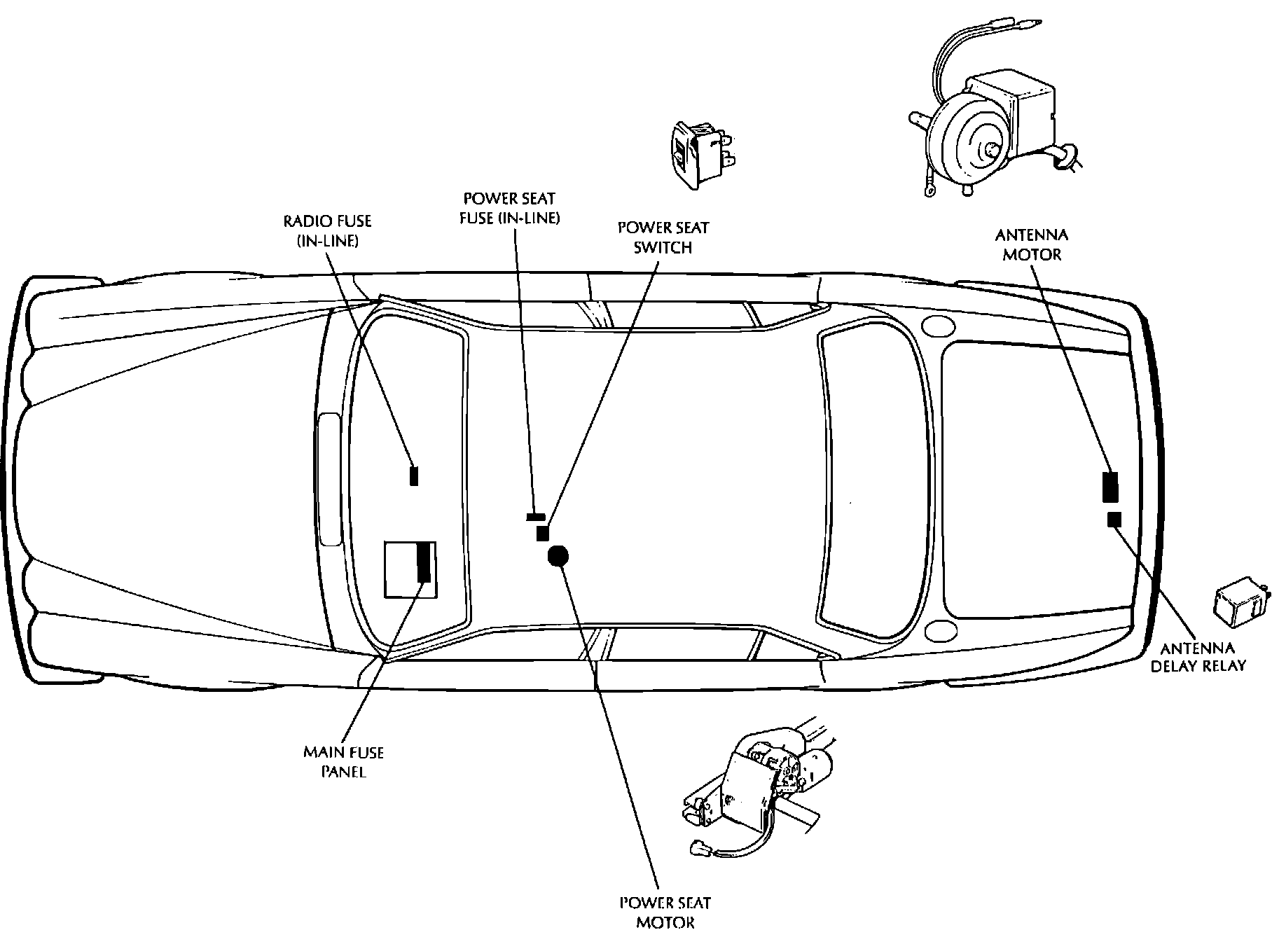 Power Seat, Early Radio & Antenna Component Locations: