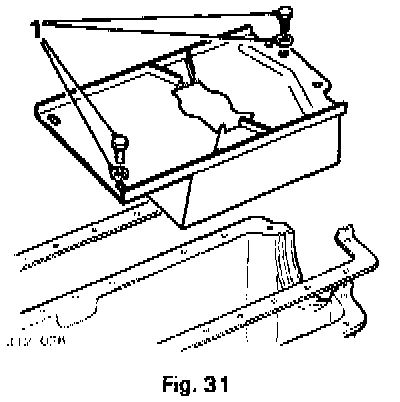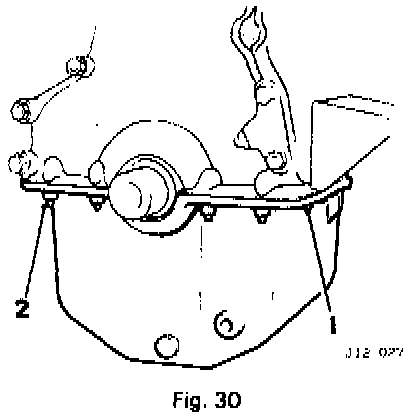 - Remove the setscrews and lock washers (1, Fig 30) and four nuts and lock washers (2, Fig 30) securing the oil pan.