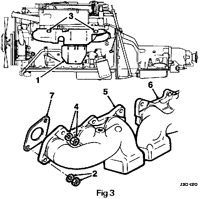Remove the manifold heat shield securing nuts and remove the heat shield (3 Fig 3).