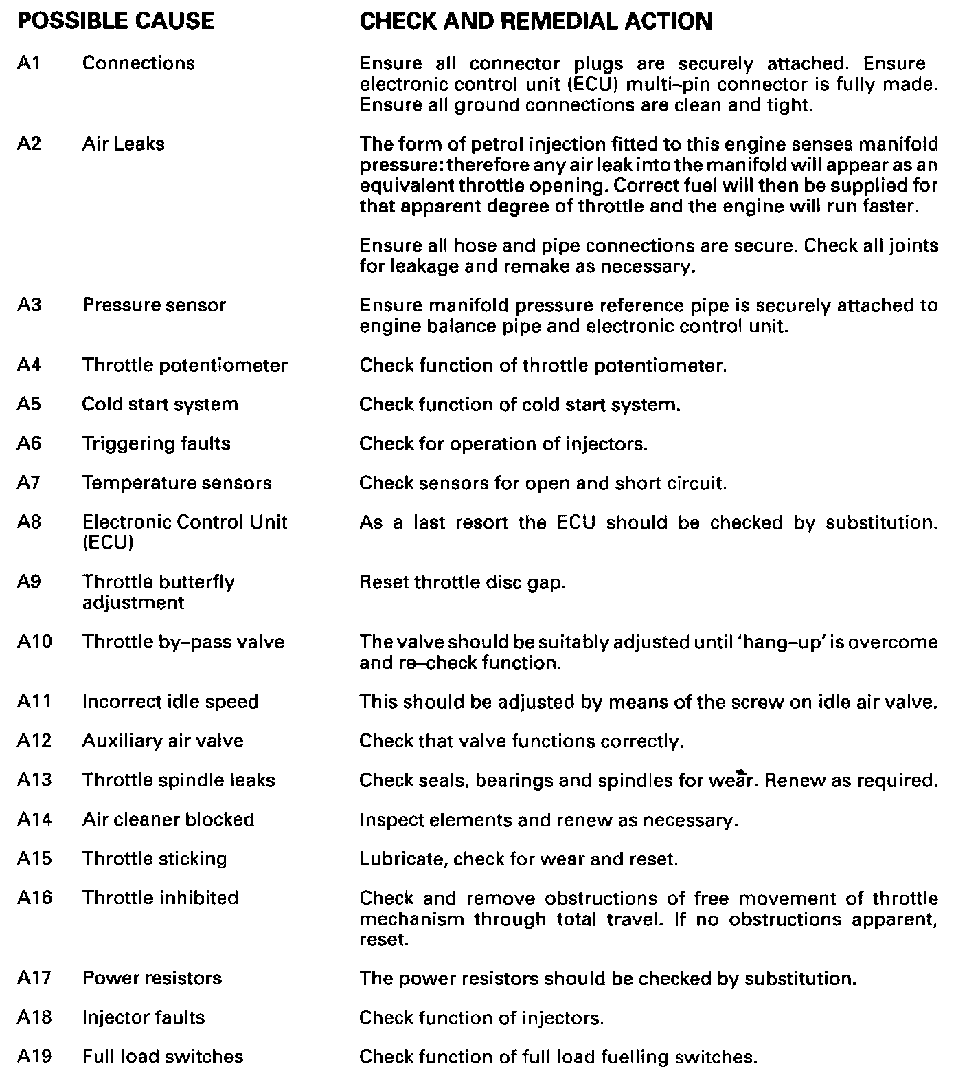 CHART A ELECTRONIC FUEL INJECTION SYSTEM CHECKS