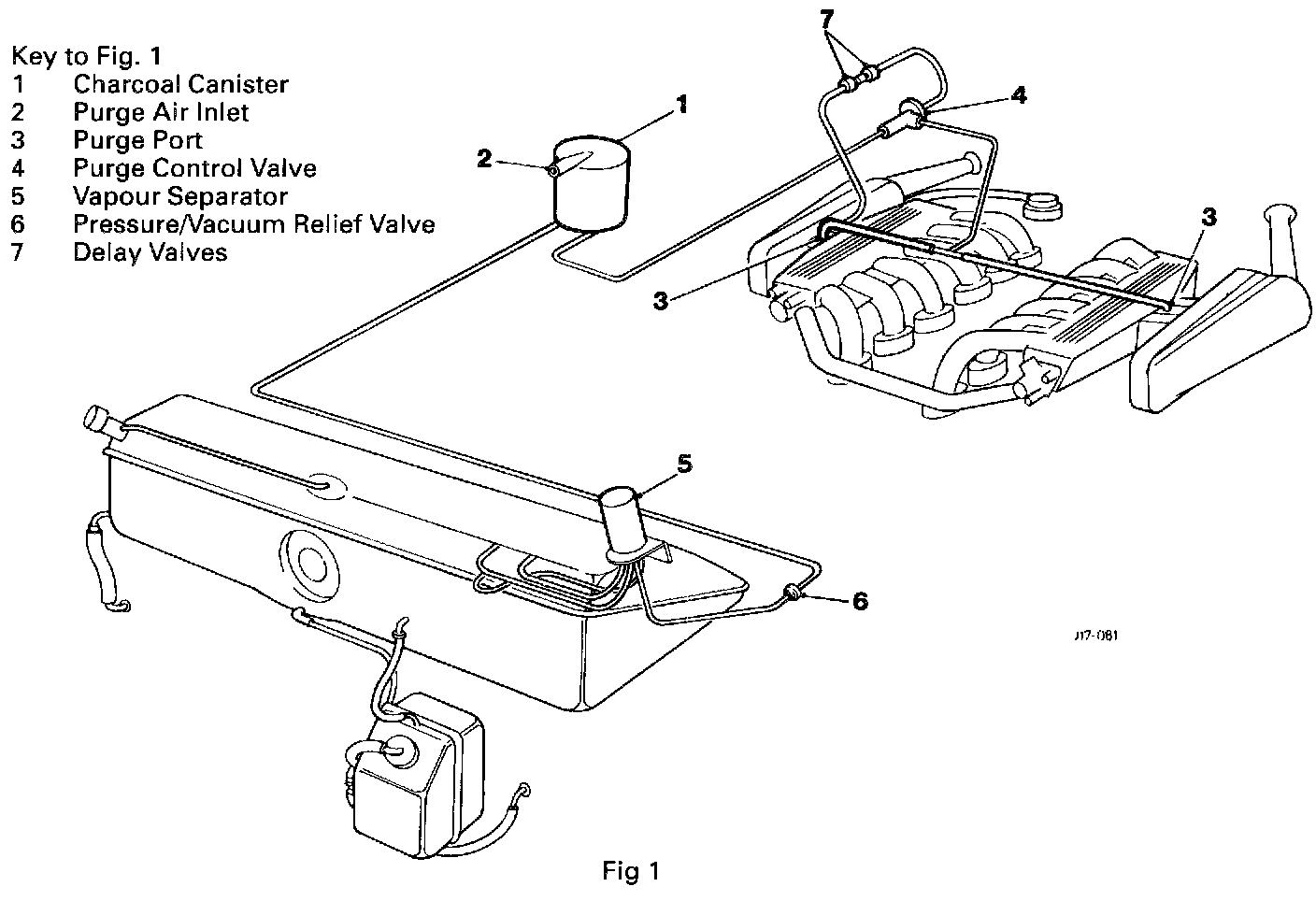 The purge depression is taken from ports in both throttle housings close to and upstream of the throttle butterflies. A restrictor fitted at the point where the purge pipe divides is used to control the maximum purge air flow rate in order to inhibit canister purging until the catalytic convertors are 'alight'. A purge control valve is operated by the delay valves, so that when it is energized (closed), canister purging does not occur for the first 45 seconds after the engine has started.