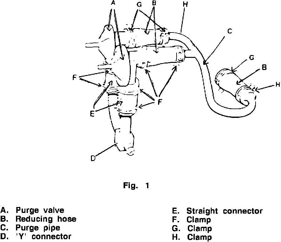 Fit clamps CAC 8774 (H, Fig 1) to the purge pipe CBC 8289 (C, Fig 1), fit reducing hoses CAC 7843 (B, Fig 1) to pipe and secure clamps.
