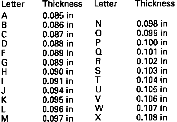- There are twenty-six shims available, each identifiable by a letter of the alphabet, starting at 0.085in (A), increasing in O.001in stages to 0.110in (Z). When the correct shim sizes have been obtained, refit shims and cam followers to the cam carrier.