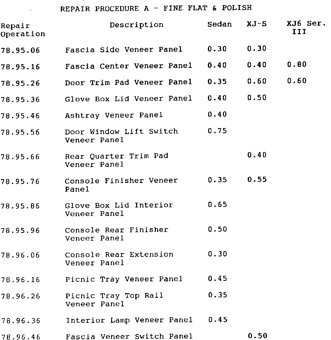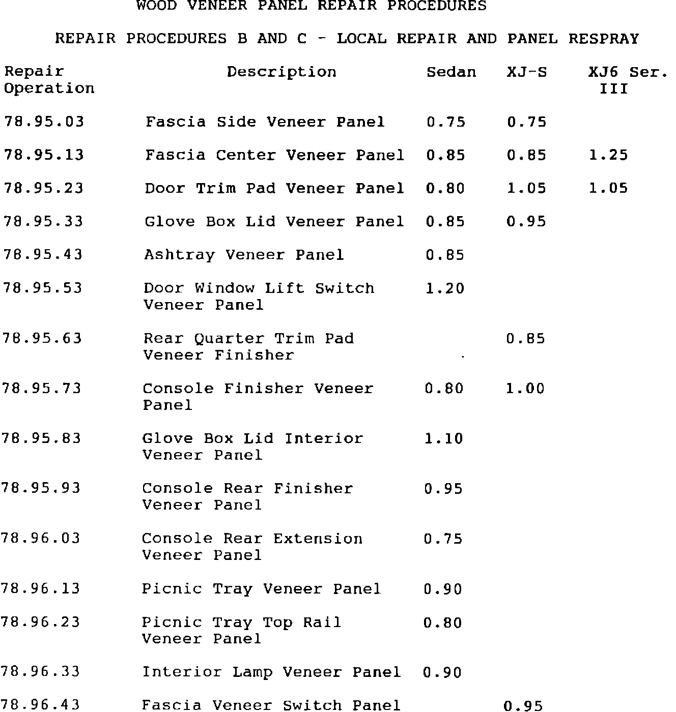 ^ Repair operation numbers and times should be taken from the following pages for repair procedures A and B. These times are inclusive covering such things as the removal and installation of the panel, repair and cleaning of the spraying equipment.