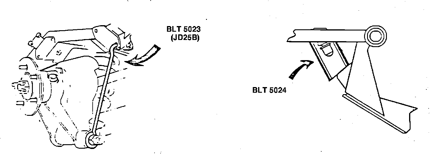 4. Compress rear suspension and hook the suspension links, BLT-5023, through the lower holes of the suspension mounting and over the nut securing the nut lower pivot pin.