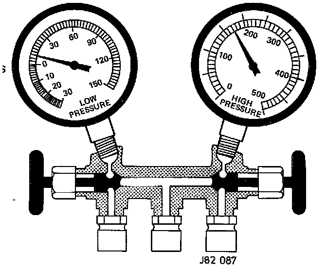 - The manifold gauge set consists of a charging manifold fitted with two stop hand valves, a compound gauge and a high pressure gauge. The compound gauge which should be connected to the suction or low pressure side of the system registers both vacuum and pressure. The high pressure gauge is connected to the delivery or high pressure side of the system.