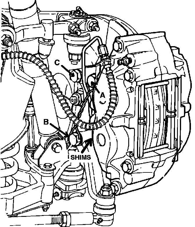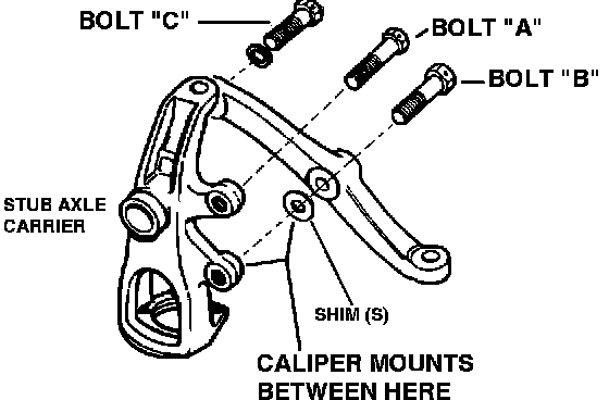 NOTE: Before removing caliper bolts, be aware that there may be shims fitted to the lower caliper mounting bolt, between the caliper and the steering arm. Remove the bolts carefully and note the position and number of shims. It will change the wheel alignment if shims are not refitted to correct position.
