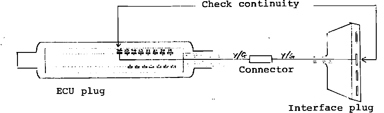Remove plug connectors from interface and ECU units (both located on rear bulkhead in trunk). Confirm open circuit condition by performing continuity check between appropriate terminations in plug connectors (see diagram). If open circuit confirmed, locate and correct.