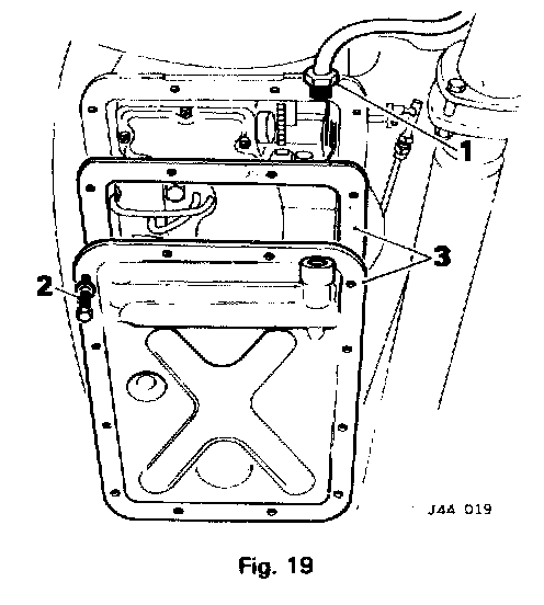 Unscrew the union nut (1, Fig. 19), withdraw the dipstick tube. drain and discard fluid. Remove the bolts and plain washers (2, Fig. 19) securing oil pan to transmission case. Lower the oil pan (3, Fig. 19) remove and discard the gasket.