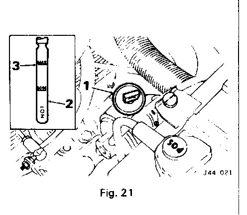 Immediately withdraw the dipstick and note the reading on the "HOT" side of the dipstick (2.Fig 21).