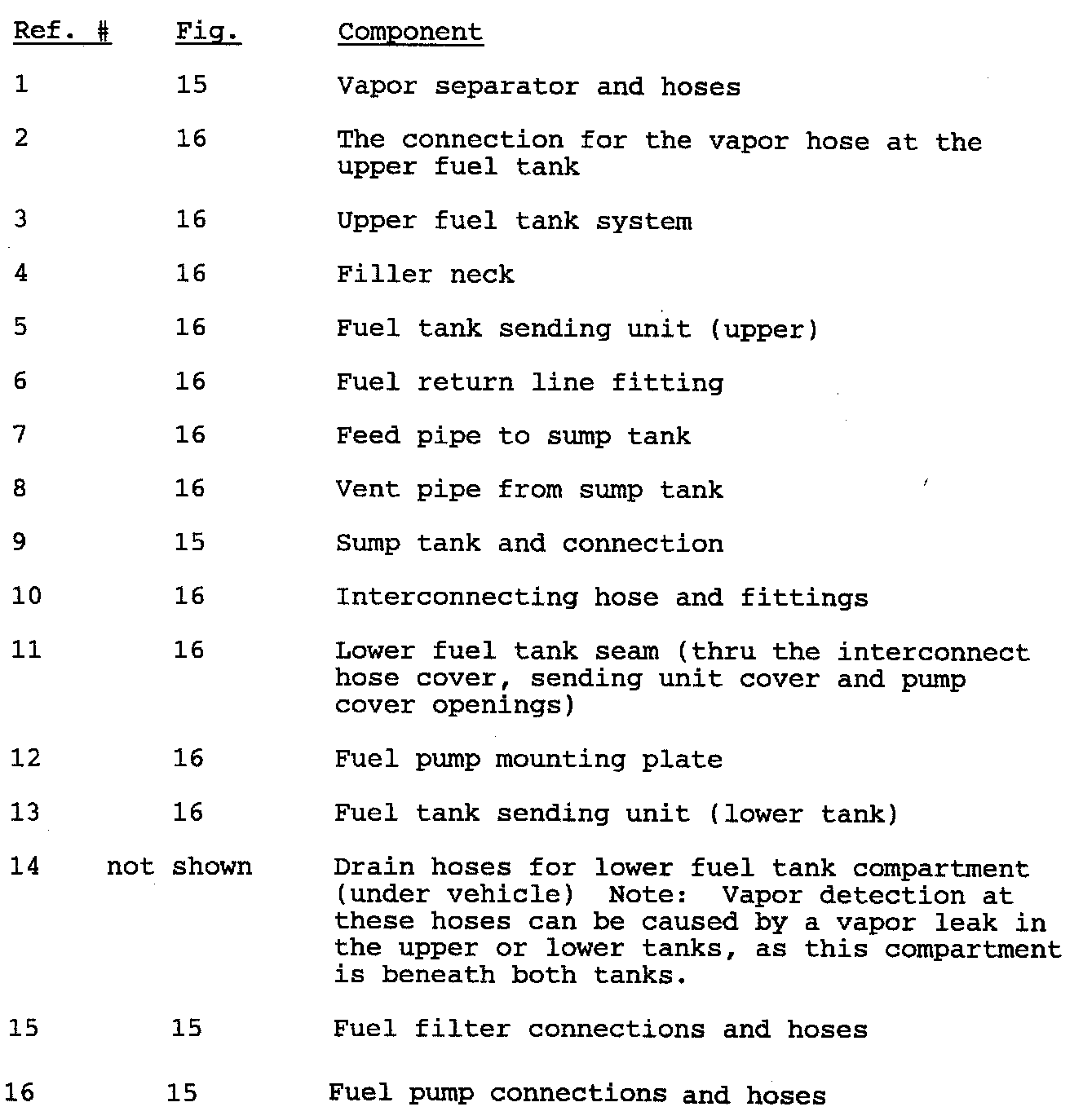 Using the combustible gas detector and figures 15 and 16 for reference, check the fuel system in the order shown.