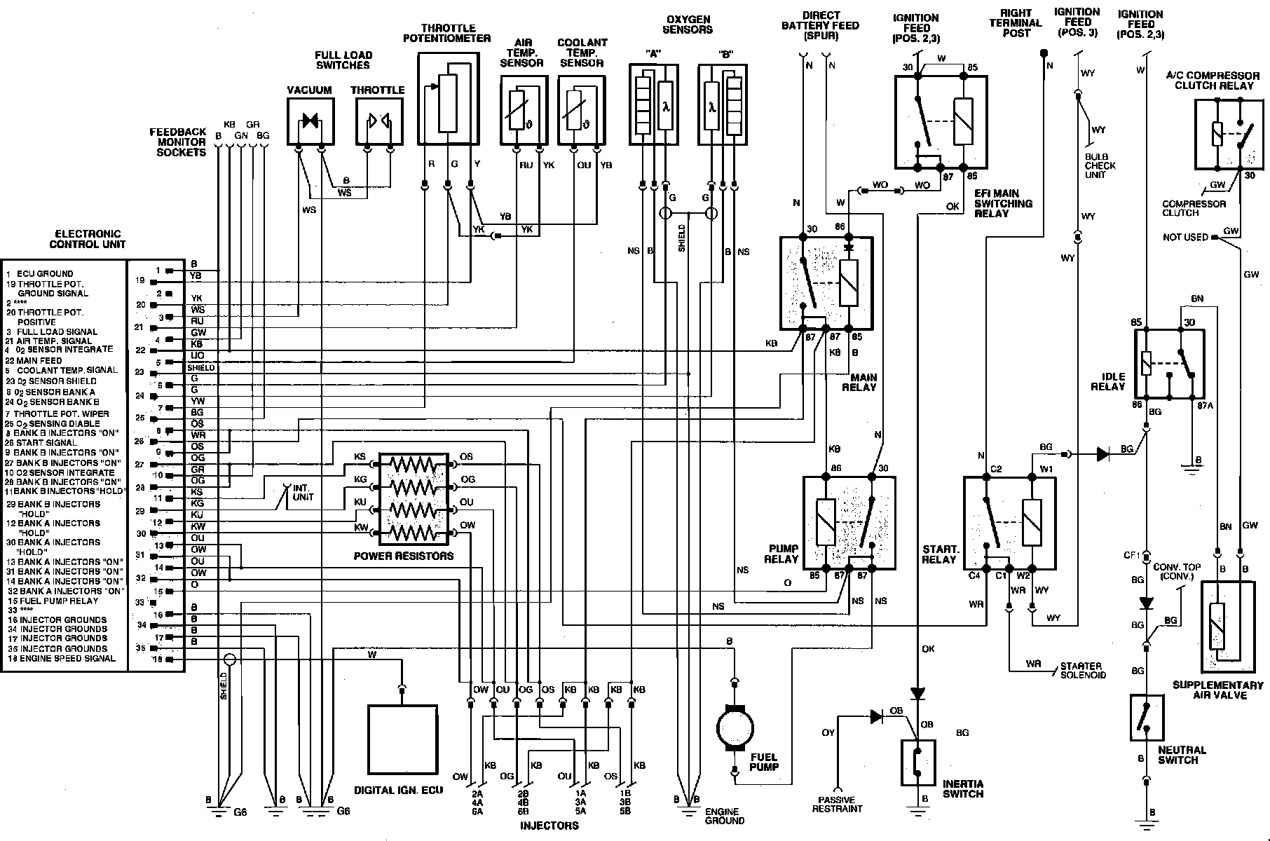 The ECU performs primarily to regulate the fuel injection system. In order to maintain optimum air/fuel ratio, the ECU monitors exhaust gas oxygen content by way of input from a pair of oxygen sensors. When adjustments are needed, the ECU varies injector pulse width ("ON" time) as the means of controlling air/fuel ratio. Factors such as engine temperature, intake air volume and temperature, gear selector position and engine speed are also factored into ECU calculations. Starting with VIN numbers delineated under SYSTEM I.D., engine speed input is received from the digital ignition system, which is controlled by a separate ECU. Prior to this, engine speed information was obtained from the coil negative terminal via the ignition amplifier.