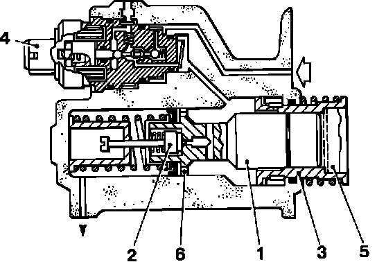 As pressure is applied to the brake pedal, the master cylinder piston (1) is moved forward by the booster piston (5). The central valve (2) closes and a pressure is built up in the front wheel brakes. Simultaneously to the forward movement of the booster piston the positioning sleeve (3) is pulled to the left. The main valve (4) is in an inoperative position. The connection between the master cylinder and the reservoir is open, the connection between the booster and the master cylinder is closed.