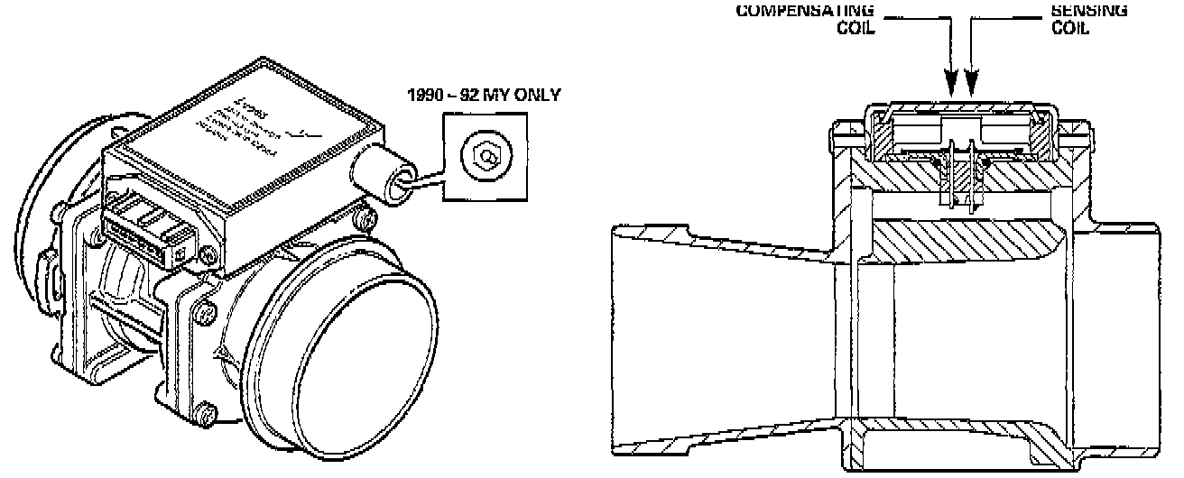 The mass air flow sensor, located in the intake tract downstream of the air cleaner, measures the volume of air flow into the engine intake. The sensor has a cast alloy body with an integral electronic module. Some of the air flows through a bypass channel containing two small wire coils: a sensing coil and a compensating coil. The sensing coil is electrically heated by the electronic module; the compensating coil remains unheated.