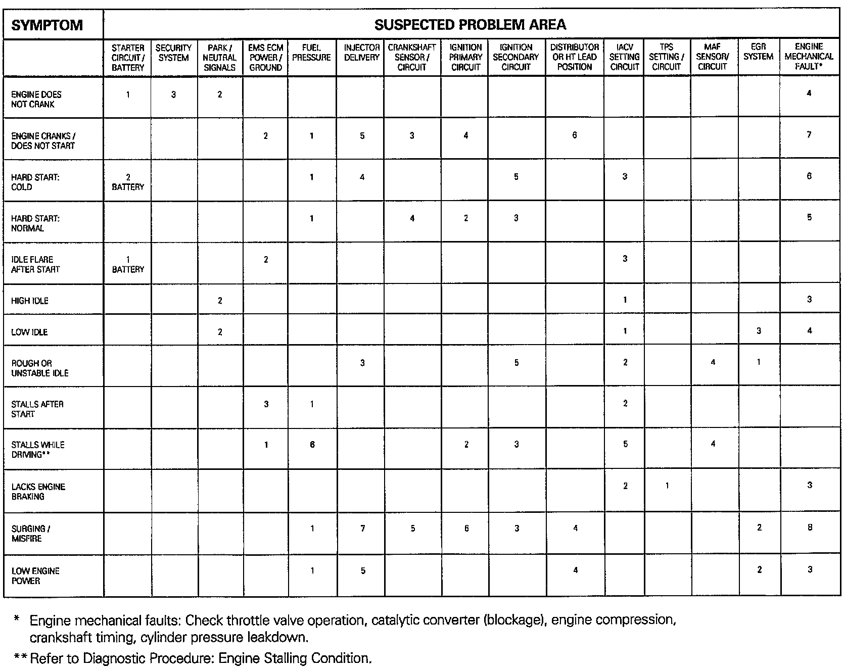 When there is a driveability complaint but no DTC, identify suspected problem areas on the following matrix. Investigate the lowest numbered areas first.