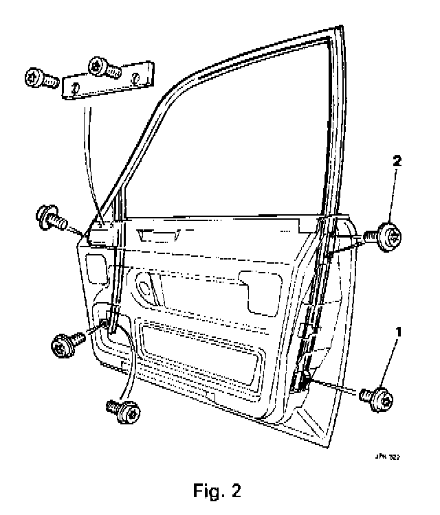 - Remove the screw (Fig. 2) securing the door glass frame to the front mounting bracket Remove the screws (Fig. 2) securing the door glass frame to the door, remove the spacer plate and remove the door glass and frame assembly, remove the tape from the glass and remove the glass from the frame.