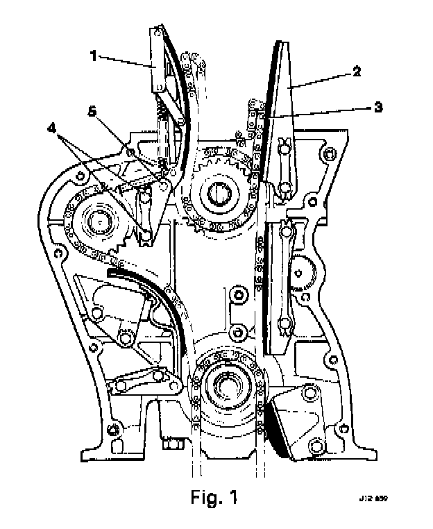 1. Remove the timing cover. Remove the elastic band from the upper dampers (1,2) and remove the upper timing chain (3).