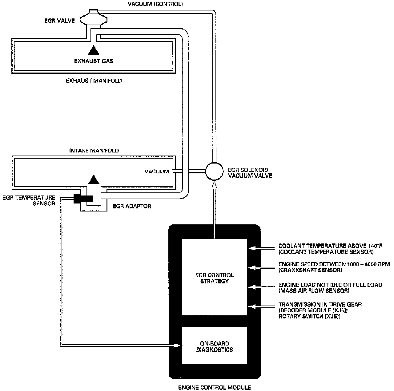 The ECM controls EGR by switching the EGR solenoid vacuum valve, which in turn, controls vacuum application to the EGR valve. The vacuum operated EGR valve controls the flow of exhaust gases between the exhaust and intake manifolds. Flow through the valve is proportional to exhaust back pressure, which is itself proportional to engine load. Vacuum is applied to the EGR valve via the ECM switched solenoid vacuum valve.