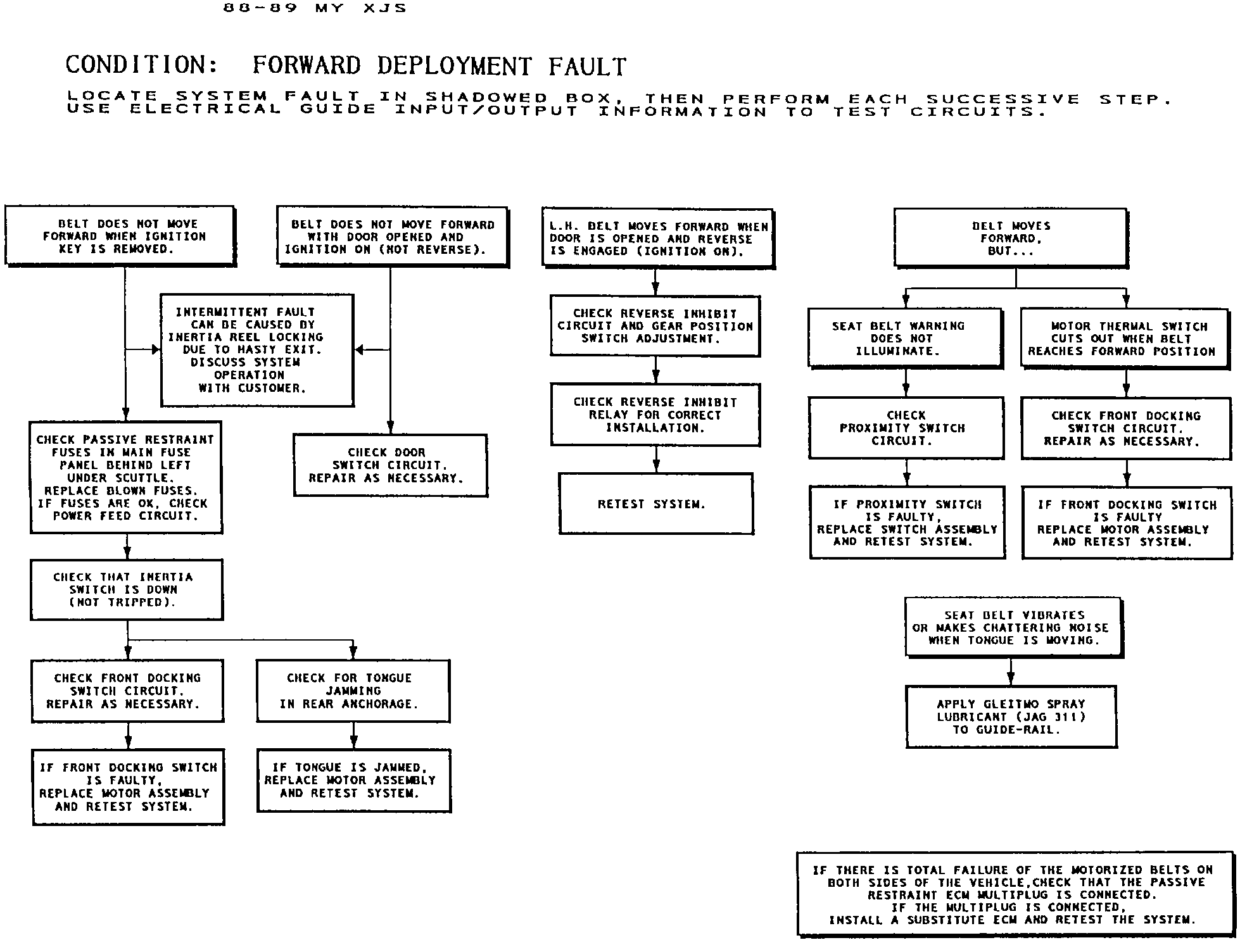 Use the Fault Analysis Charts to diagnose and repair faults. For circuit information, refer to the appropriate Electrical Guide passive restraint diagram.