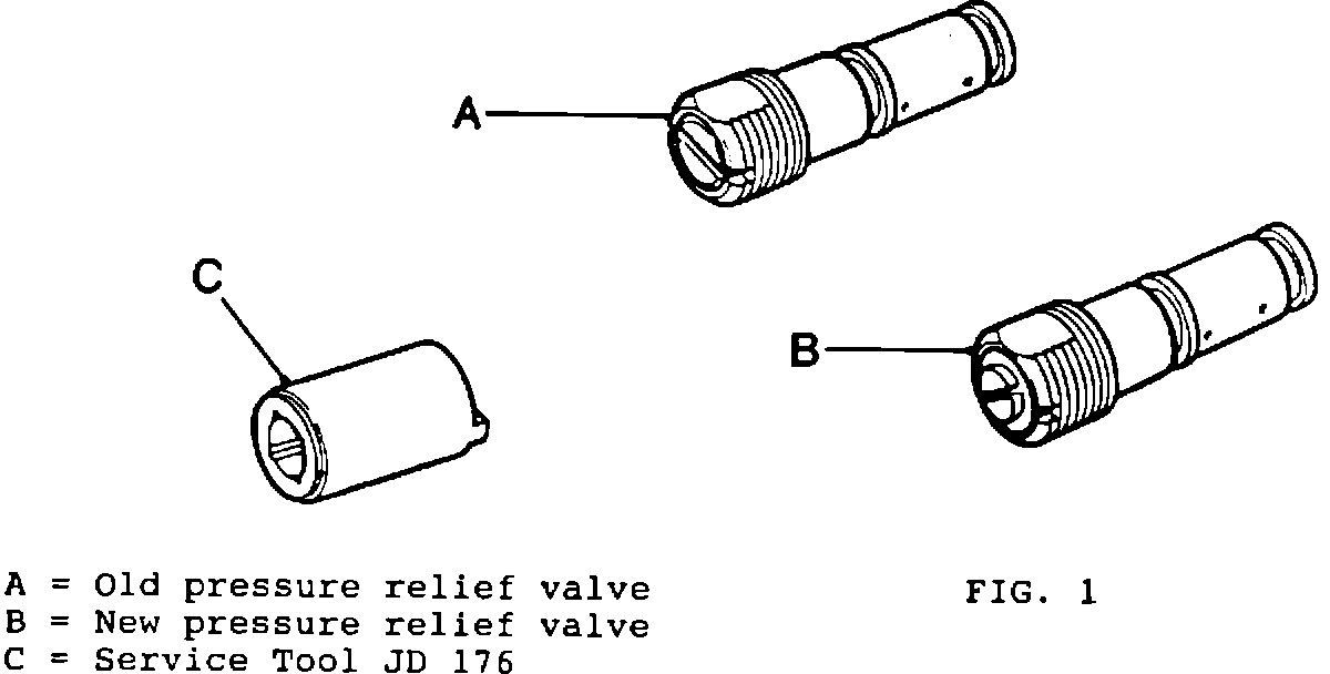 NOTE: Service Tool JD 176 (Fig. 1 C) should be seated firmly against the face of the pressure relief valve during the removal procedure.