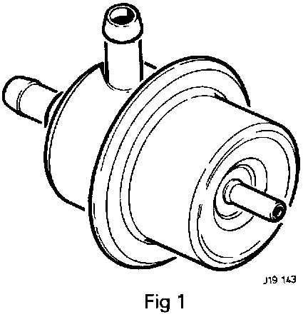 The fuel pressure regulator is attached to the main fuel rail and consists of a metal housing containing a spring loaded diaphragm. When the pressure setting of the regulator is exceeded, the diaphragm moves, exposing an opening to an overflow duct which allows excess fuel to return to the fuel tank, causing a drop in fuel pressure. The reduced fuel pressure allows the diaphragm to move back to its original position, thereby closing the fuel return outlet. This sequence of events is repeated as long as the pump is running. In this way, fuel pressure is held constant as fuel demand varies. The pressure setting is adjusted to the correct value during production when the outer spring housing is compressed until the correct spring load is obtained. This is not adjustable in service.