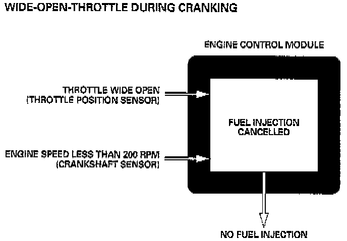 If the ECM senses that the throttle is wide open (throttle position sensor input) during cranking (less than 200 rpm), fuel injection is canceled to help clear a flooded engine.