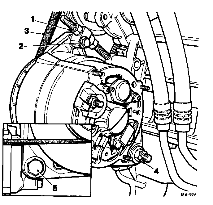 - Loosen but do not remove the alternator link arm trunnion bolt (2 Fig 1).