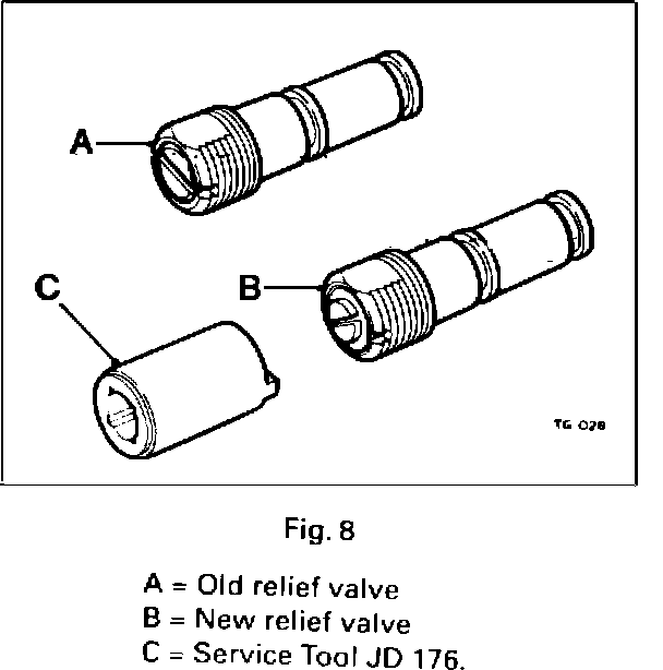 2. The pressure relief valve in the valve block is replaced with the revised one, Part. No. CCC3832 using Service Tool JD 176. Refer to Fig. 8 for ease of identification