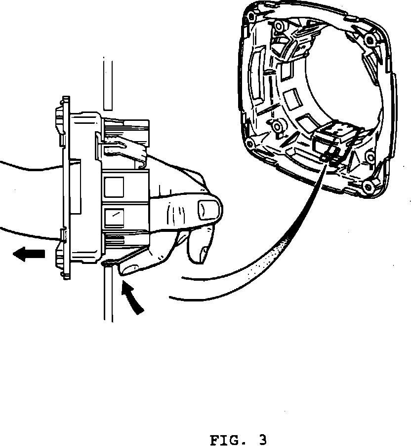 ^ Reach in and locate the three retaining clips holding the speaker housing to the heelboard, (fig. 3). Depress the clips and remove the housing.