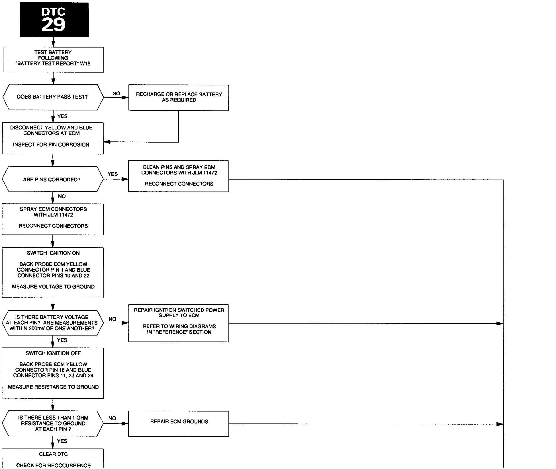 Check the battery condition (load test). If necessary. recharge or replace the battery. Clear the code and check for a reoccurrence. If DTC 29 does not reflag, the code may have been flagged during a previous period of low battery voltage. Do not replace an ECM if DTC does not reflag.