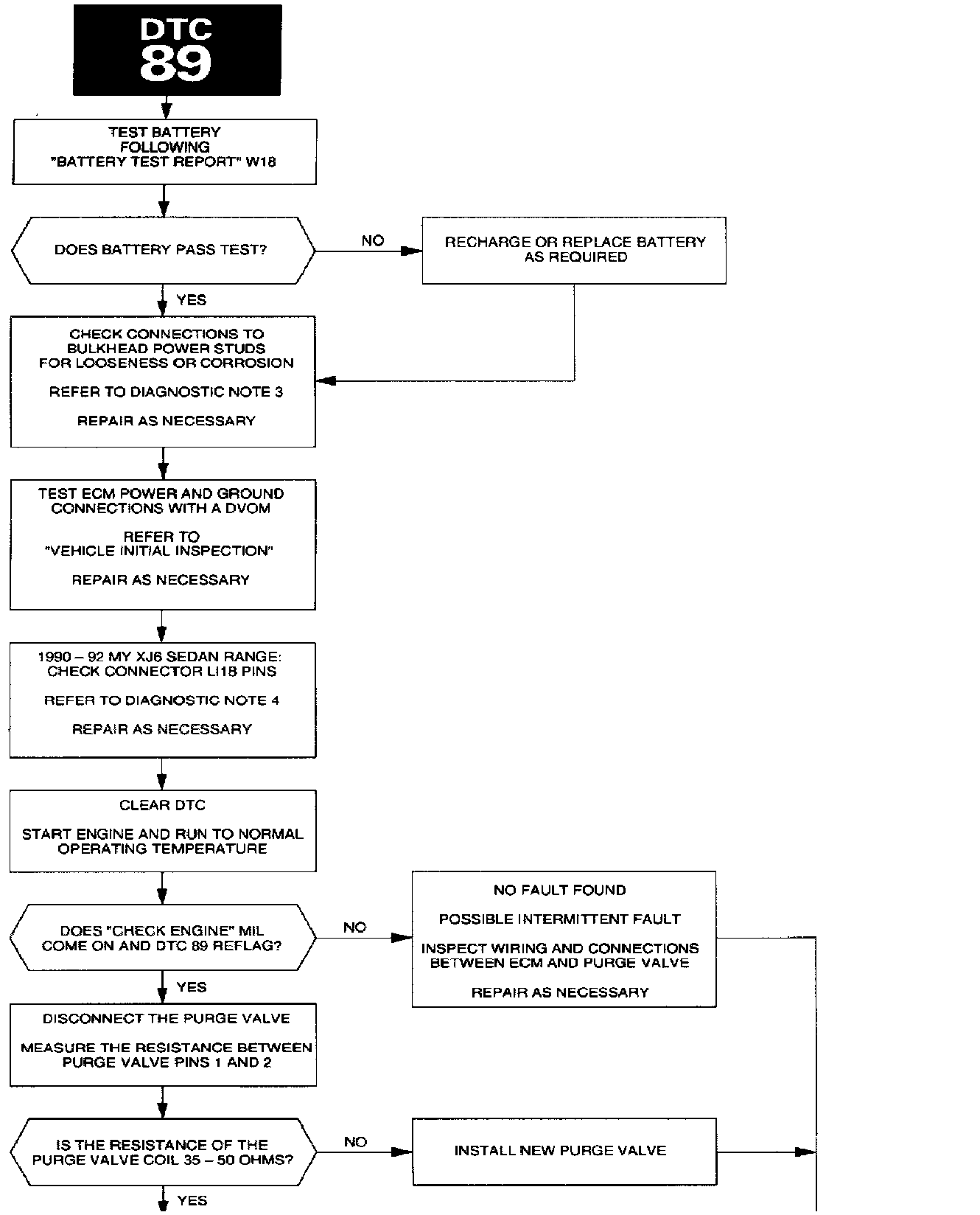 The ECM will flag DTC 89 if the drive circuit voltage is greater than approximately 2.5 volts when the purge valve is driven closed, or if the drive circuit voltage is less than approximately 10.5 volts when the purge valve is driven open.