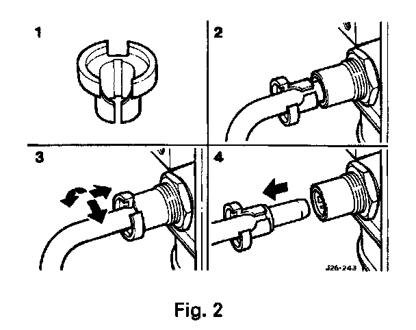 Procedure: 'open' the plastic tool and fit around the pipe (2 Fig. 2). Turn the tool clockwise and anti-clockwise while pushing into the radiator boss (3 Fig. 2). Push / turn the tool into the boss until resistance is felt,the pipe retaining fingers in the radiator boss will then be released and the pipe can be pulled from the radiator (4 Fig. 2), complete with the tool. Plug the apertures in the pipes and the radiator.